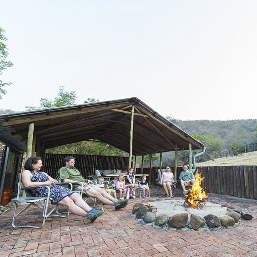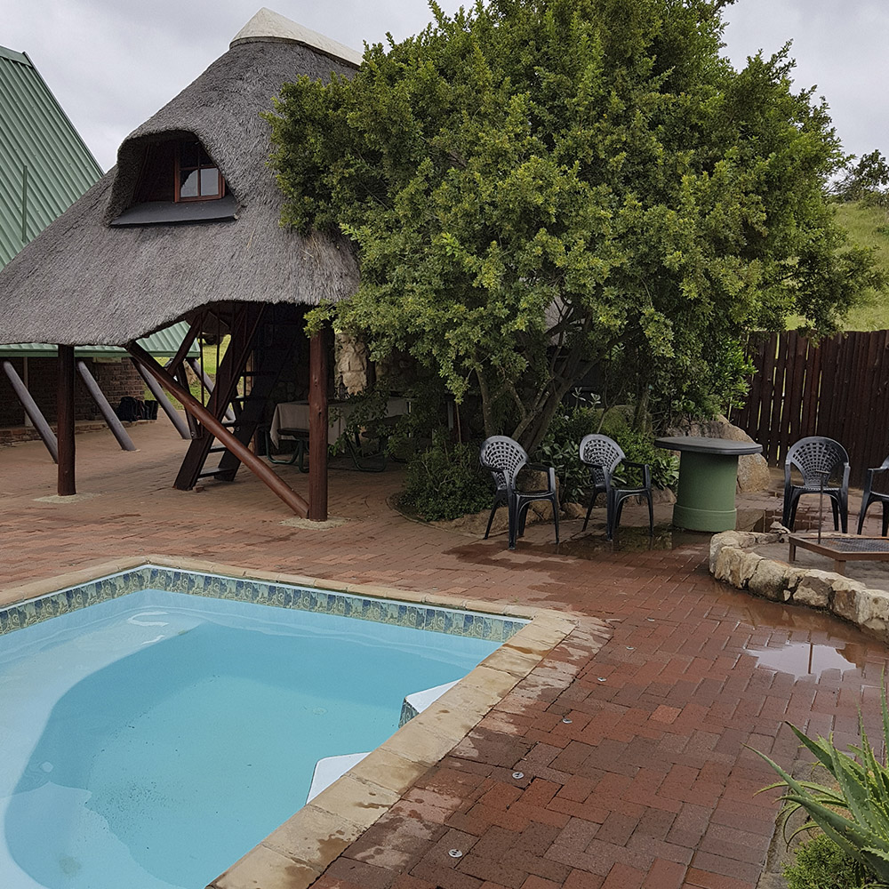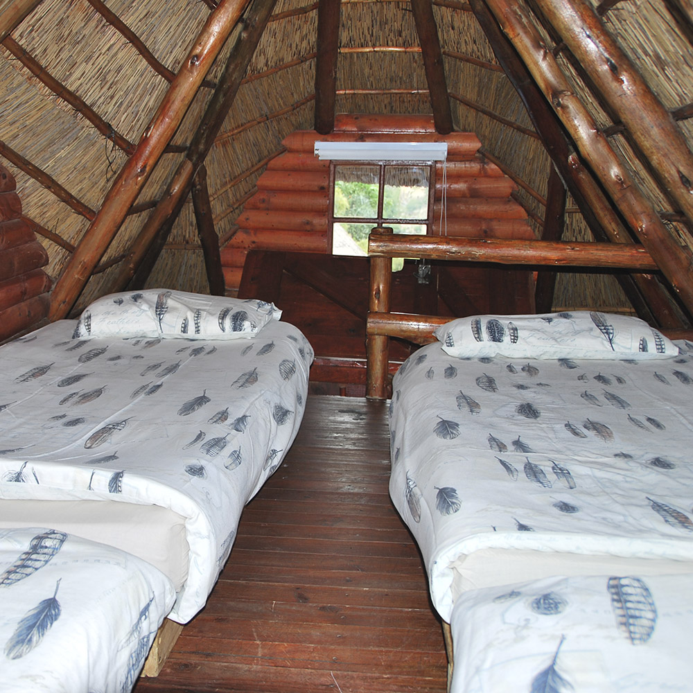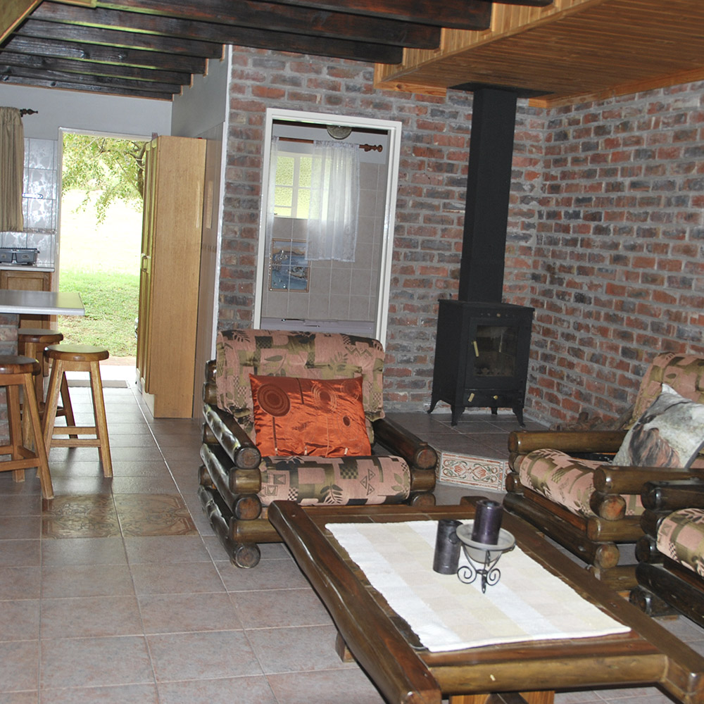 4 Enkelstaande kamers met 1 driekwart bed en 4 enkelbeddens elk (2 bunkerbeddens). Beddegoed word voorsien. Sonkragligte. Geen kragpunte in chalets. Groot kuierlapa met braaigeriewe, onderdak kombuis met gasvrieskas, 6 gasbranders en opwasgeriewe. Potte, panne en eetgerei word voorsien. Eetgerei in elke chalet (vlekvryestaal borde, bekers en glase, asook messe, vurke en lepels). Beperkte hoeveelheid vuurmaakhout beskikbaar.