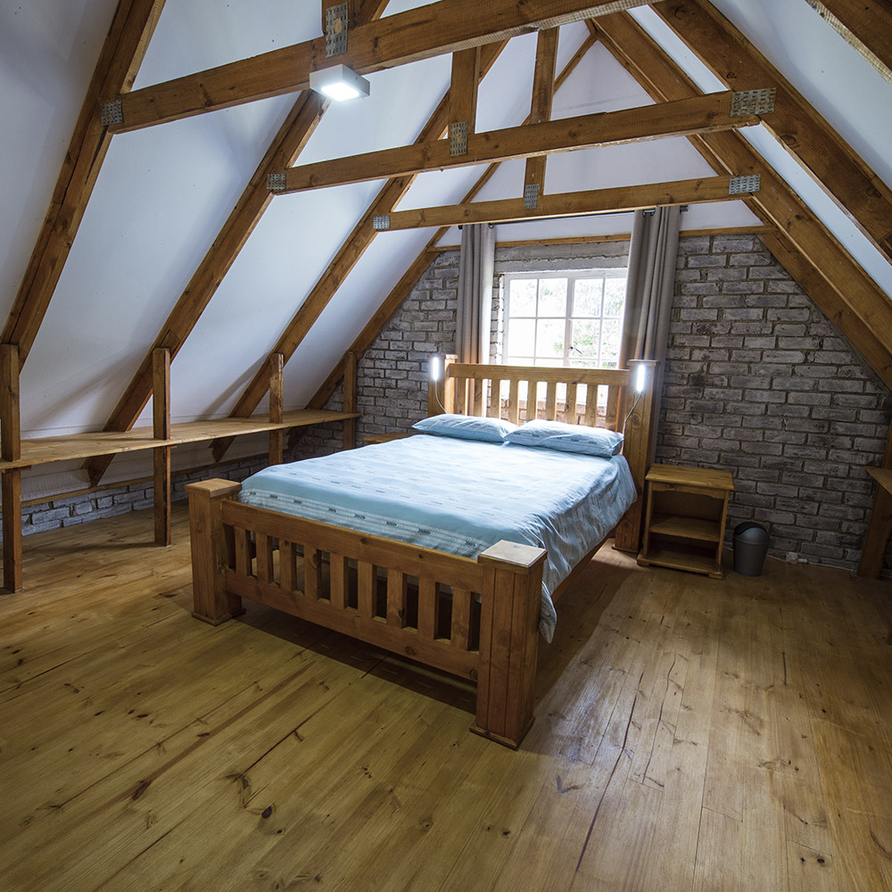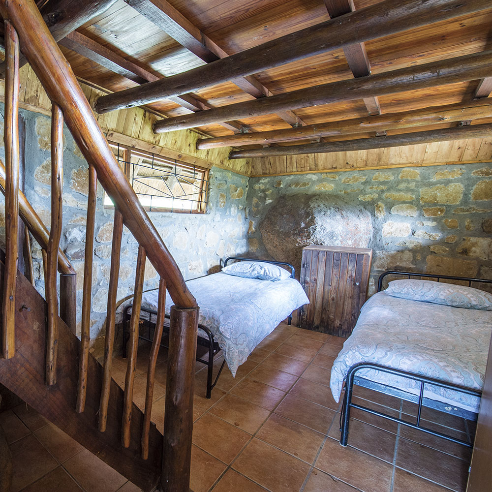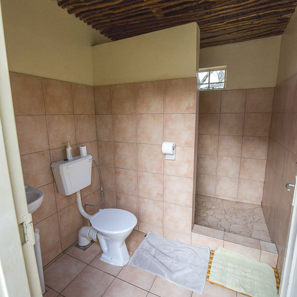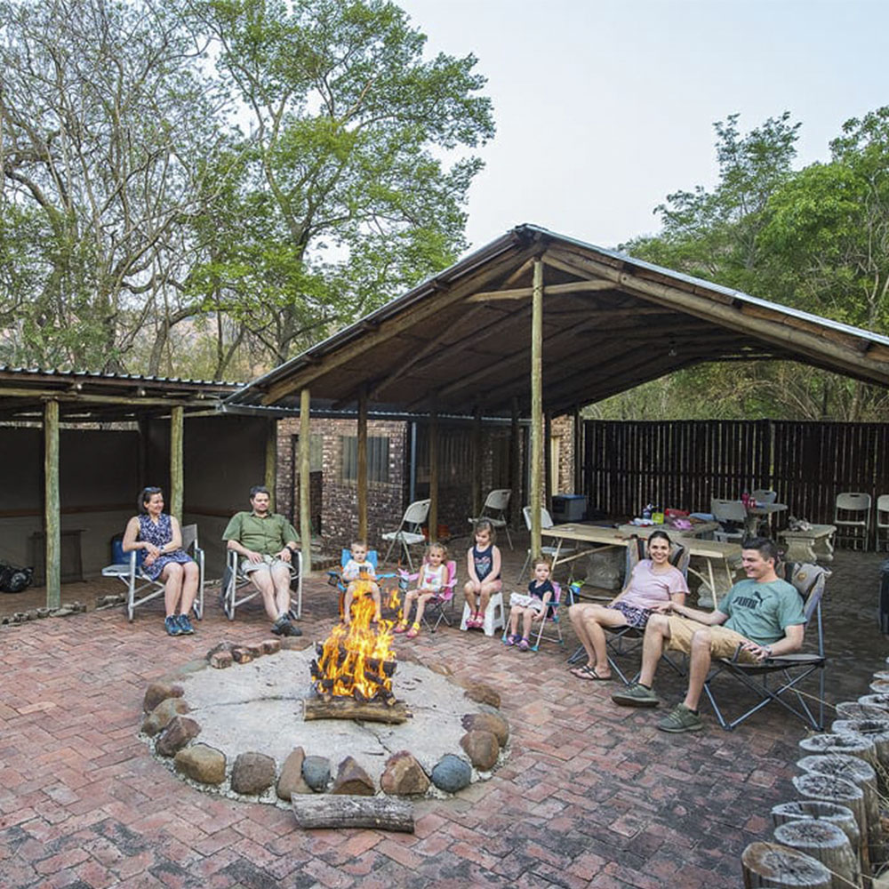 4 Enkelstaande kamers met 1 driekwart bed en 4 enkelbeddens elk (2 bunkerbeddens). Beddegoed word voorsien. Sonkragligte. Geen kragpunte in chalets. Groot kuierlapa met braaigeriewe, onderdak kombuis met gasvrieskas, 6 gasbranders en opwasgeriewe. Potte, panne en eetgerei word voorsien. Eetgerei in elke chalet (vlekvryestaal borde, bekers en glase, asook messe, vurke en lepels). Beperkte hoeveelheid vuurmaakhout beskikbaar.